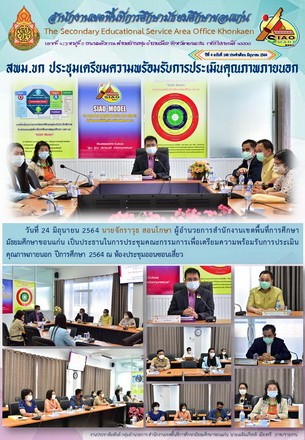 | วันที่ 24 มิถุนายน 2564 นายจักราวุธ สอนโกษา ผู้อำนวยการสำนักงานเขตพื้นที่การศึกษามัธยมศึกษาขอนแก่น เป็นประธานในการประชุมคณะกรรมการเพื่อเตรียมความพร้อมรับการประเมินคุณภาพภายนอก ปีการศึกษา 2564 ณ ห้องประชุมออนซอนเสี่ยว | |