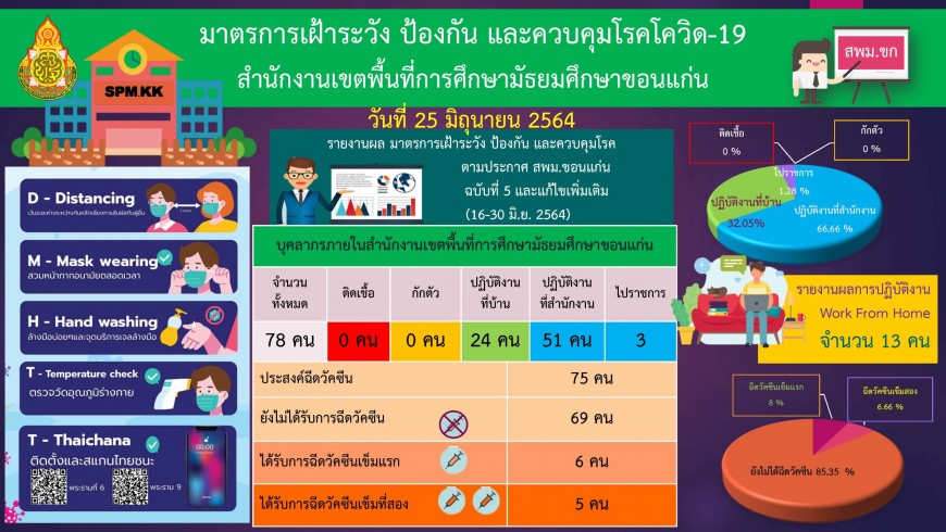 | มาตรการเฝ้าระวัง ป้องกัน และควบคุมการแพร่ระบาดของโรคติดเชื้อไวรัส โคโรนา 2019 ของสำนักงานเขตพื้นที่การศึกษามัธยมศึกษาขอนแก่น วันที่ 25 มิ.ย. 2564 | |