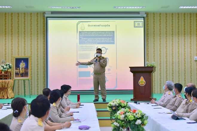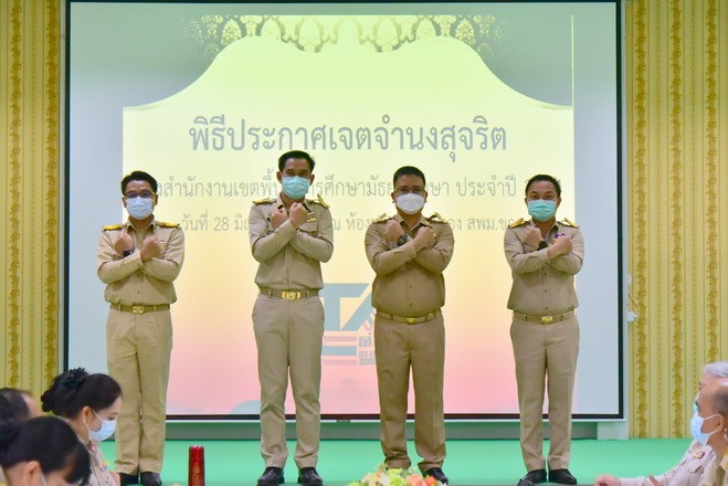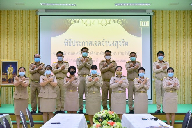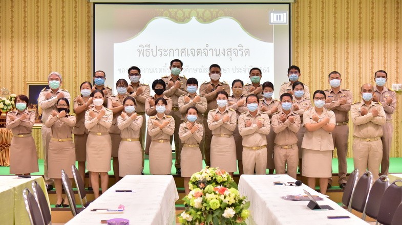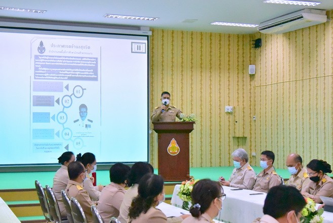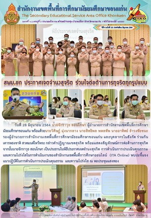 วันที่ 28 มิถุนายน 2564 นายจักราวุธ สอนโกษา ผู้อำนวยการสำนักงานเขตพื้นที่การศึกษามัธยมศึกษาขอนแก่น พร้อมด้วยนายวิศิษฏ์ มุ่งนากลาง นายสิทธิพล พหลทัพ นายอาทิตย์ ธำรงชัยชนะ รองผู้อำนวยการสำนักงานเขตพื้นที่การศึกษามัธยมศึกษาขอนแก่น และบุคลากรในสังกัด ร่วมกันเคารพธงชาติ สวดมนต์ไหว้พระ กล่าวคำปฏิญาณเขตสุจริต พร้อมแสดงสัญลักษณ์การต่อต้านการทุจริต จากนั้นนายจักราวุธ สอนโกษา เป็นประธานในพิธีประกาศเจตจำนงสุจริต การดำเนินการประเมินคุณธรรม และความโปร่งใสในการดำเนินงานของสำนักงานเขตพื้นที่การศึกษาออนไลน์ (ITA Online) พบปะชี้แจงแนวปฏิบัติในการดำเนินการประเมินคุณธรรม และความโปร่งใส ณ หอประชุมแสงทอง |