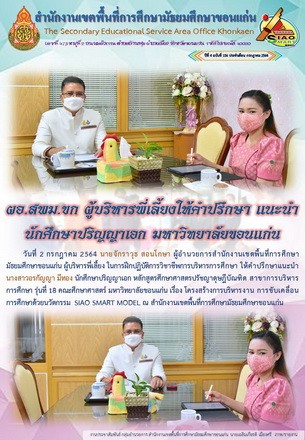 | วันที่ 2 กรกฎาคม 2564 นายจักราวุธ สอนโกษา ผู้อำนวยการสำนักงานเขตพื้นที่การศึกษามัธยมศึกษาขอนแก่น ผู้บริหารพี่เลี้ยง ในการฝึกปฏิบัติการวิชาชีพการบริหารการศึกษา ให้คำปรึกษาแนะนำ นางสาวอรกัญญา มีทอง นักศึกษาปริญญาเอก หลักสูตรศึกษาศาสตรปรัชญาดุษฎีบัณฑิต สาขาการบริหารการศึกษา รุ่นที่ 18 คณะศึกษาศาสตร์ มหาวิทยาลัยขอนแก่น เรื่อง โครงสร้างการบริหารงาน การขับเคลื่อนการศึกษาด้วยนวัตกรรม SIAO SMART MODEL ณ สำนักงานเขตพื้นที่การศึกษามัธยมศึกษาขอนแก่น | |