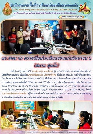 วันที่ 2 กรกฎาคม 2564 นายจักราวุธ สอนโกษา ผู้อำนวยการสำนักงานเขตพื้นที่การศึกษามัธยมศึกษาขอนแก่น พร้อมด้วยนายประวิทย์กาสา บุญจุฑาสิริกุล ที่ปรึกษา สพม.ขก ลงพื้นที่ตรวจเยี่ยมโรงเรียนขอนแก่นวิทยายน 2 (สมาน สุเมโธ) เพื่อติดตามการจัดการเรียนการสอนในสถานการณ์การแพร่ระบาดของโรคติดเชื้อไวรัสโคโรนา 2019 (COVID-19) การบริหารจัดการและการดำเนินงานของสถานศึกษาในช่วงปิดสถานศึกษาด้วยเหตุพิเศษ พร้อมชี้แนะแนวทางการพัฒนาการศึกษาให้สอดคล้องกับบริบทของโรงเรียน นำสู่การปฏิบัติ ด้วยนวัตกรรม SIAO SMART MODEL โดยมีนายวรรณประกรณ์ จุมพลน้อย ผู้อำนวยการโรงเรียนขอนแก่นวิทยายน 2 (สมาน สุเมโธ) และคณะครู นำเสนอข้อมูลรายละเอียด นำเยี่ยมชมสถานที่ ณ โรงเรียนขอนแก่นวิทยายน 2 (สมาน สุเมโธ) |