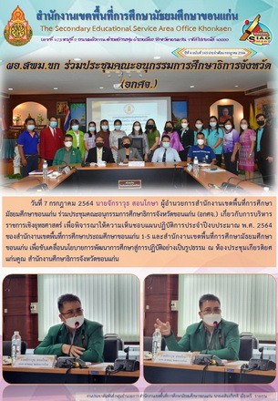 | วันที่ 7 กรกฎาคม 2564 นายจักราวุธ สอนโกษา ผู้อำนวยการสำนักงานเขตพื้นที่การศึกษามัธยมศึกษาขอนแก่น ร่วมประชุมคณะอนุกรรมการศึกษาธิการจังหวัดขอนแก่น (อกศจ.) เกี่ยวกับการบริหารราชการเชิงยุทธศาสตร์ เพื่อพิจารณาให้ความเห็นชอบแผนปฏิบัติการประจำปีงบประมาณ พ.ศ. 2564 ของสำนักงานเขตพื้นที่การศึกษาประถมศึกษาขอนแก่น 1-5 และสำนักงานเขตพื้นที่การศึกษามัธยมศึกษาขอนแก่น เพื่อขับเคลื่อนนโยบายการพัฒนาการศึกษาสู่การปฏิบัติอย่างเป็นรูปธรรม ณ ห้องประชุมเกียรติยศแก่นคูณ สำนักงานศึกษาธิการจังหวัดขอนแก่น | |