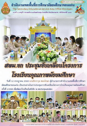 | วันที่ 12 กรกฎาคม 2564 นายจักราวุธ สอนโกษา ผู้อำนวยการสำนักงานเขตพื้นที่การศึกษามัธยมศึกษาขอนแก่น เป็นประธานในการประชุมการขับเคลื่อนโครงการโรงเรียนคุณภาพมัธยมศึกษา ครั้งที่ 1/2564 เพื่อพัฒนาโรงเรียนในสังกัด ณ หอประชุมแสงทอง | |