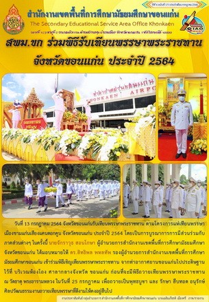 วันที่ 13 กรกฎาคม 2564 จังหวัดขอนแก่นรับเทียนพรรษาพระราชทาน ตามโครงการแห่เทียนพรรษา เมืองขามแก่นเสียงแคนดอกคูน จังหวัดขอนแก่น ประจำปี 2564 โดยเป็นการบูรณาการการมีส่วนร่วมกับภาคส่วนต่างๆ ในครั้งนี้ นายจักราวุธ สอนโกษา ผู้อำนวยการสำนักงานเขตพื้นที่การศึกษามัธยมศึกษาจังหวัดขอนแก่น ได้มอบหมายให้ ดร.สิทธิพล พหลทัพ รองผู้อำนวยการสำนักงานเขตพื้นที่การศึกษามัธยมศึกษาขอนแก่น เข้าร่วมพิธีเชิญเทียนพรรษาพระราชทาน จากท่าอากาศยานขอนแก่นไปประดิษฐานไว้ที่ บริเวณห้องโถง ศาลากลางจังหวัด ขอนแก่น ก่อนที่จะมีพิธีถวายเทียนพรรษาพระราชทาน ณ วัดธาตุ พระอารามหลวง ในวันที่ 25 กรกฎาคม เพื่อถวายเป็นพุทธบูชา และ รักษา สืบทอด อนุรักษ์ศิลปวัฒนธรรมงานถวายเทียนพรรษาที่ดีงามให้คงอยู่สืบไป |