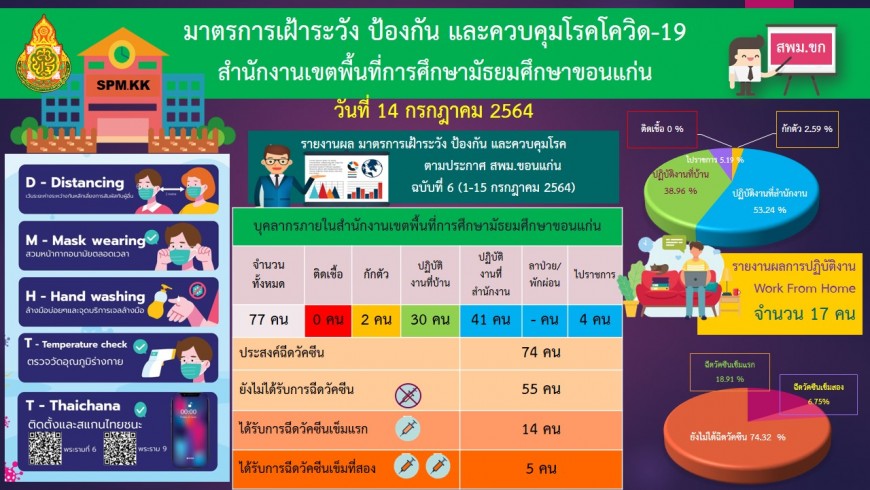 | มาตรการเฝ้าระวัง ป้องกัน และควบคุมการแพร่ระบาดของโรคติดเชื้อไวรัส โคโรนา 2019 ของสำนักงานเขตพื้นที่การศึกษามัธยมศึกษาขอนแก่น วันที่ 14 ก.ค. 2564 | |