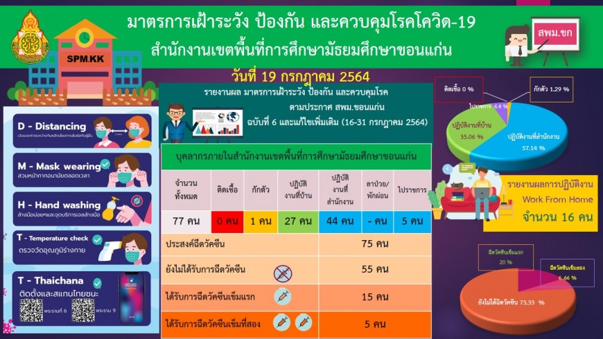 | มาตรการเฝ้าระวัง ป้องกัน และควบคุมการแพร่ระบาดของโรคติดเชื้อไวรัส โคโรนา 2019 ของสำนักงานเขตพื้นที่การศึกษามัธยมศึกษาขอนแก่น วันที่ 19 ก.ค. 2564 | |