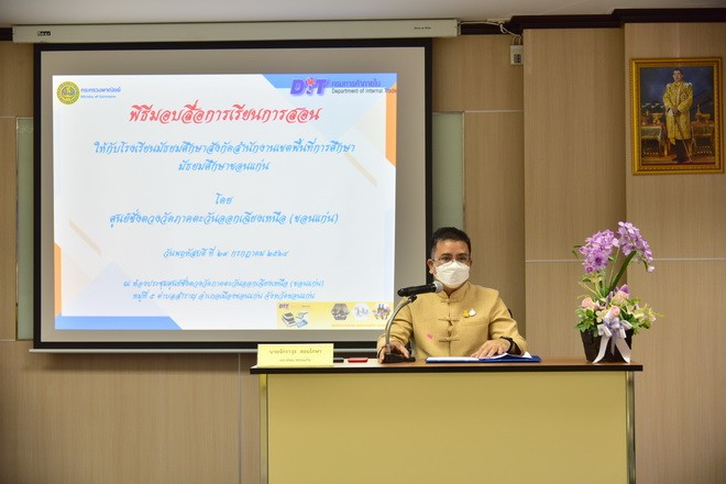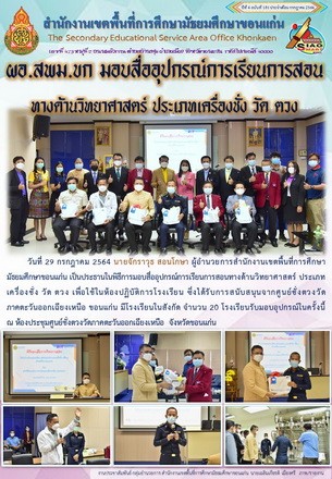 | วันที่ 29 กรกฎาคม 2564 นายจักราวุธ สอนโกษา ผู้อำนวยการสำนักงานเขตพื้นที่การศึกษามัธยมศึกษาขอนแก่น เป็นประธานในพิธีการมอบสื่ออุปกรณ์การเรียนการสอนทางด้านวิทยาศาสตร์ ประเภทเครื่องชั่ง วัด ตวง เพื่อใช้ในห้องปฏิบัติการโรงเรียน ซึ่งได้รับการสนับสนุนจากศูนย์ชั่งตวงวัดภาคตะวันออกเฉียงเหนือ ขอนแก่น มีโรงเรียนในสังกัด จำนวน 20 โรงเรียนรับมอบอุปกรณ์ในครั้งนี้ ณ ห้องประชุมศูนย์ชั่งตวงวัดภาคตะวันออกเฉียงเหนือ จังหวัดขอนแก่น | |
