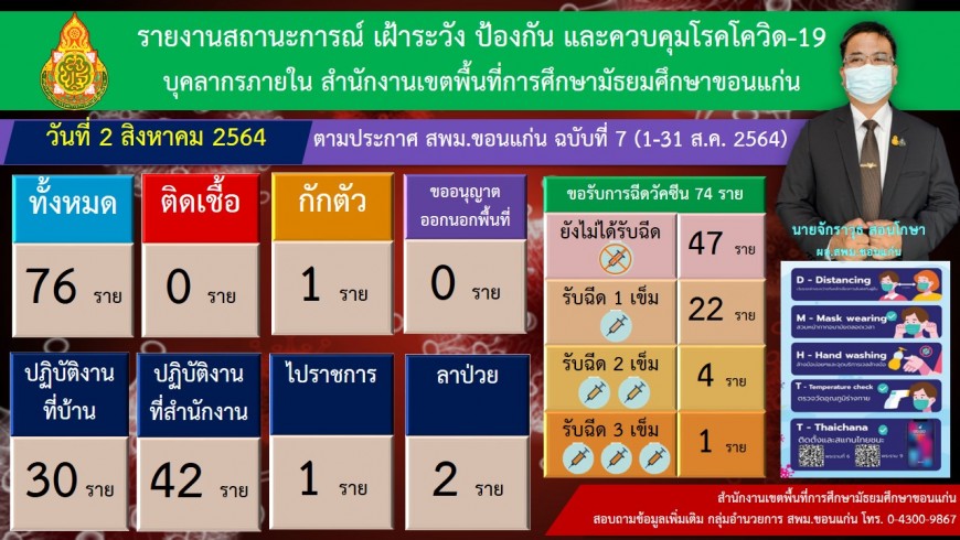 | วันที่ 2 สิงหาคม 2564 รายงานสถานการณ์ เฝ้าระวัง ป้องกัน และควบคุมการแพร่ระบาดของโรคติดเชื้อไวรัส โคโรนา 2019 ของบุคลากรในสำนักงานเขตพื้นที่การศึกษามัธยมศึกษาขอนแก่น ตามประกาศ สพม.ขก ฉบับที่ 7 | |