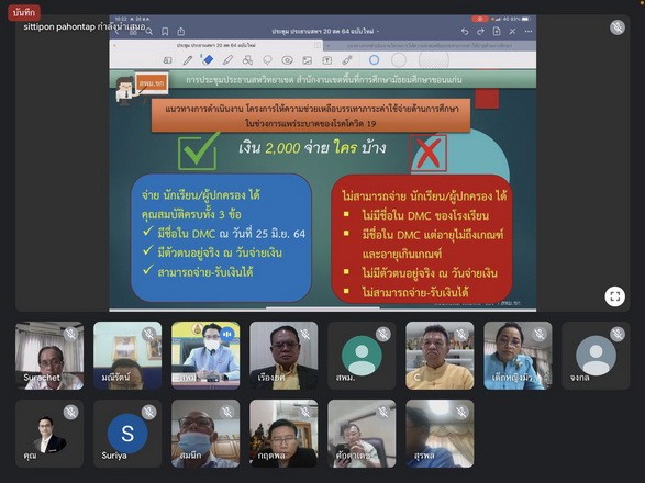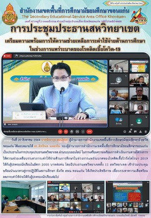 วันที่ 20 สิงหาคม 2564 นายจักราวุธ สอนโกษา ผู้อำนวยการสำนักงานเขตพื้นที่การศึกษามัธยมศึกษาจังหวัดขอนแก่น ได้มอบหมายให้ ดร.สิทธิพล พหลทัพ รองผู้อำนวยการสำนักงานเขตพื้นที่การศึกษามัธยมศึกษาขอนแก่น เป็นประธานในการประชุมประธานสหวิทยาเขต ผ่านระบบออนไลน์ ในการเตรียมความพร้อมการดำเนินงานตามโครงการ ให้ความช่วยเหลือบรรเทาภาระค่าใช้จ่ายด้านการศึกษาในช่วงการแพร่ระบาดของโรคติดเชื้อไวรัสโคโรนา 2019 ให้กับผู้ปกครองนักเรียนในอัตรา 2000 บาทต่อคน โดยมีประธานสหวิทยาเขตทั้ง 11 สหวิทยาเขต เข้าร่วมประชุม พร้อมนำแนวทางสู่การปฏิบัติในสถานศึกษา สังกัด สพม.ขอนแก่น ให้เกิดประสิทธิภาพ เพื่อบรรเทาความเดือดร้อนลดภาระค่าใช้จ่ายให้กับผู้ปกครองนักเรียนต่อไป |