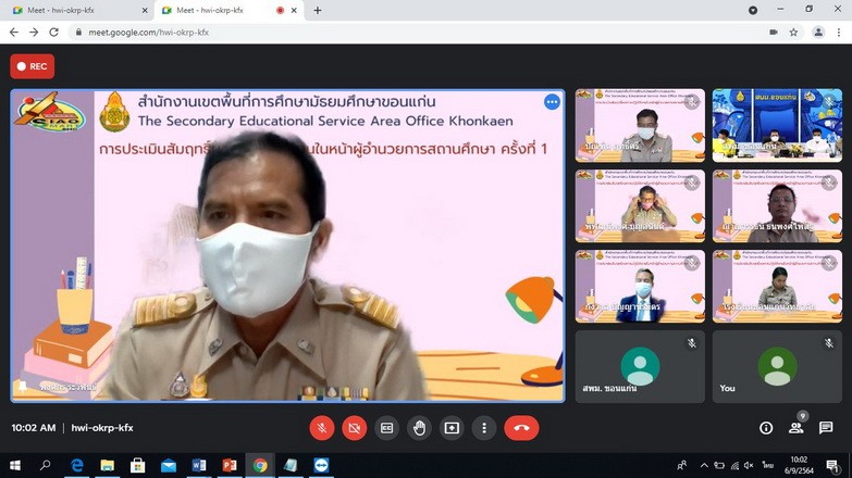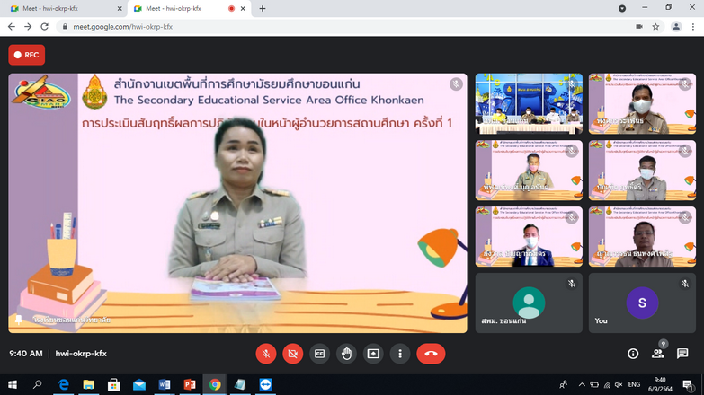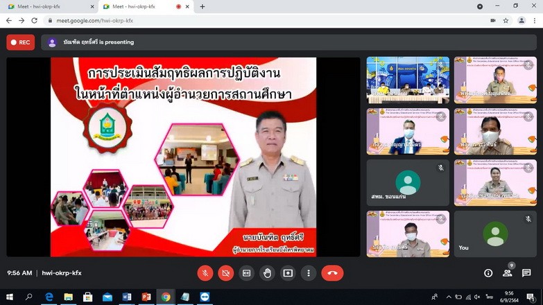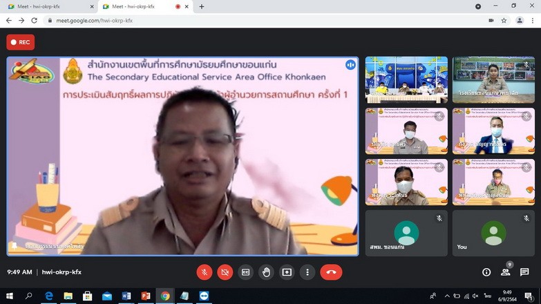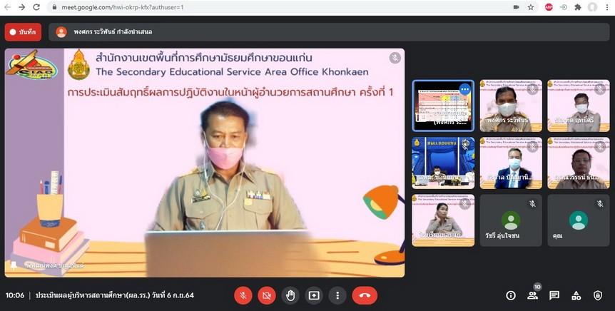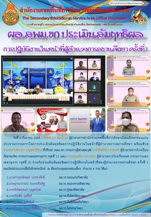 วันที่ 6 กันยายน 2564 นายจักราวุธ สอนโกษา ผู้อำนวยการสำนักงานเขตพื้นที่การศึกษามัธยมศึกษาขอนแก่น ประธานกรรมการในการประเมินสัมฤทธิผลการปฏิบัติงานในหน้าที่ผู้อำนวยการสถานศึกษา พร้อมด้วยนายประวิทย์กาสา บุญจุฑาสิริกุล ที่ปรึกษา สพม.ขก กรรมการผู้ทรงคุณวุฒิ นายวิไลศักดิ์ วรรณศรี ผู้อำนวยการโรงเรียนกัลยาณวัตร กรรมการและเลขานุการ (ชุดที่ 1) และนายบุญเหลือ ทองอ่อน ผู้อำนวยการโรงเรียนพล กรรมการและเลขานุการ (ชุดที่ 2) ร่วมกันประเมินสัมฤทธิผลการปฏิบัติงานในหน้าที่ของผู้อำนวยการสถานศึกษา ครั้งที่ 1 จำนวน 6 ราย ได้แก่