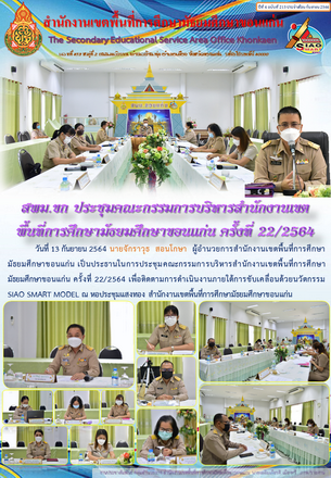 | วันที่ 13 กันยายน 2564 นายจักราวุธ สอนโกษา ผู้อำนวยการสำนักงานเขตพื้นที่การศึกษามัธยมศึกษาขอนแก่น เป็นประธานในการประชุมคณะกรรมการบริหารสำนักงานเขตพื้นที่การศึกษามัธยมศึกษาขอนแก่น ครั้งที่ 22/2564 เพื่อติดตามการดำเนินงานภายใต้การขับเคลื่อนด้วยนวัตกรรม SIAO SMART MODEL ณ หอประชุมแสงทอง สำนักงานเขตพื้นที่การศึกษามัธยมศึกษาขอนแก่น | |