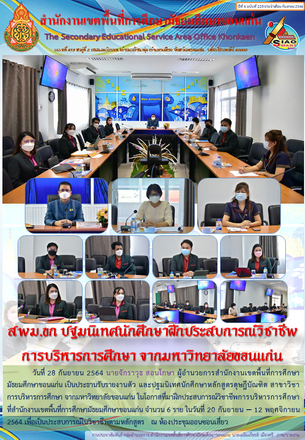 | วันที่ 28 กันยายน 2564 นายจักราวุธ สอนโกษา ผู้อำนวยการสำนักงานเขตพื้นที่การศึกษามัธยมศึกษาขอนแก่น เป็นประธานรับรายงานตัว และปฐมนิเทศนักศึกษาหลักสูตรดุษฎีบัณฑิต สาขาวิชาการบริหารการศึกษา จากมหาวิทยาลัยขอนแก่น ในโอกาสที่มาฝึกประสบการณ์วิชาชีพการบริหารการศึกษาที่สำนักงานเขตพื้นที่การศึกษามัธยมศึกษาขอนแก่น จำนวน 6 ราย ในวันที่ 20 กันยายน – 12 พฤศจิกายน 2564 เพื่อเป็นประสบการณ์ในวิชาชีพตามหลักสูตร ณ ห้องประชุมออนซอนเสี่ยว | |