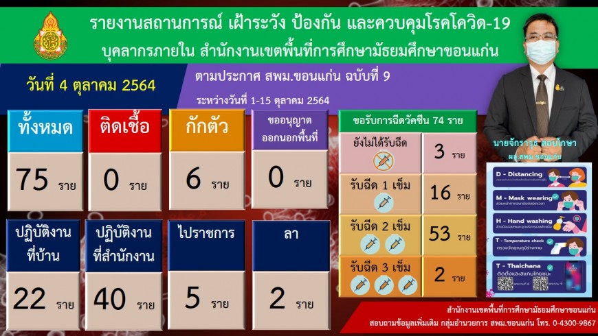 | วันที่ 4 ตุลาคม 2564 รายงานสถานการณ์ เฝ้าระวัง ป้องกัน และควบคุมการแพร่ระบาดของโรคติดเชื้อไวรัส โคโรนา 2019 ของบุคลากรในสำนักงานเขตพื้นที่การศึกษามัธยมศึกษาขอนแก่น ตามประกาศ สพม.ขก ฉบับที่ 9 | |