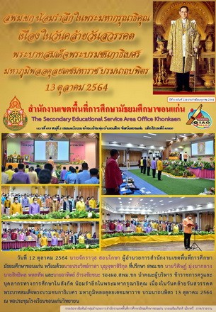 | วันที่ 12 ตุลาคม 2564 นายจักราวุธ สอนโกษา ผู้อำนวยการสำนักงานเขตพื้นที่การศึกษามัธยมศึกษาขอนแก่น พร้อมด้วยนายประวิทย์กาสา บุญจุฑาสิริกุล ที่ปรึกษา สพม.ขก นายวิศิษฏ์ มุ่งนากลาง,นายสิทธิพล พหลทัพ และนายอาทิตย์ ธำรงชัยชนะ รองผอ.สพม.ขก นำคณะผู้บริหาร ข้าราชการครูและบุคลากรทางการศึกษาในสังกัด น้อมรำลึกในพระมหากรุณาธิคุณ เนื่องในวันคล้ายวันสวรรคต พระบาทสมเด็จพระบรมชนกาธิเบศร มหาภูมิพลอดุลยเดชมหาราช บรมนาถบพิตร 13 ตุลาคม 2564ณ หอประชุมโรงเรียนขอนแก่นวิทยายน | |