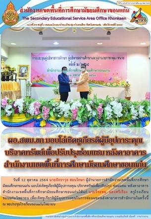 วันที่ 12 ตุลาคม 2564 นายจักราวุธ สอนโกษา ผู้อำนวยการสำนักงานเขตพื้นที่การศึกษามัธยมศึกษาขอนแก่น มอบโล่เชิดชูเกียรติผู้มีอุปการะคุณ บริจาคทรัพย์เพื่อปรับปรุง ซ่อมแซม หลังคาอาคารสำนักงานเขตพื้นที่การศึกษามัธยมศึกษาขอนแก่นให้แก่ นายวีระชน แสงศรีเรือง ครูโรงเรียนขอนแก่นวิทยายน เพื่อเชิดชูเกียรติผู้มีอุปการะคุณในการซ่อมแซมหลังคาอาคารสำนักงานในครั้งนี้ ณ หอประชุมโรงเรียนขอนแก่นวิทยายน |