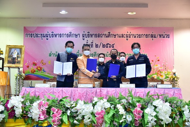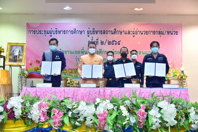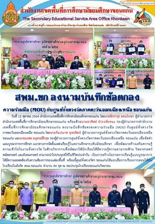 วันที่ 12 ตุลาคม 2564 สำนักงานเขตพื้นที่การศึกษามัธยมศึกษาขอนแก่น โดยนายจักราวุธ สอนโกษา ผู้อำนวยการสำนักงานเขตพื้นที่การศึกษามัธยมศึกษาขอนแก่น พร้อมด้วยนายอาทิตย์ ธำรงชัยชนะ รองผู้อำนวยการสำนักงานเขตพื้นที่การศึกษามัธยมศึกษาขอนแก่น ลงนามบันทึกข้อตกลงความร่วมมือ (MOU) กับศูนย์ชั่งตวงวัดภาคตะวันออกเฉียงเหนือ ขอนแก่น โดยนายกัมปนาท ยุทธศิลป์ ผู้อำนวยการศูนย์ชั่งตวงวัดภาคตะวันออกเฉียงเหนือ ขอนแก่น และนายมงคล อนุสรณ์ธีรกุล รองผู้อำนวยการศูนย์ชั่งตวงวัดภาคตะวันออกเฉียงเหนือ ขอนแก่น เพื่อจัดทำแผนบูรณาการการศึกษา แนวทางการจัดตั้งแหล่งเรียนรู้ในสถานศึกษาระดับมัธยมศึกษา เพื่อพัฒนาสร้างเสริมความรู้ความเข้าใจในงานชั่งตวงวัด ในด้านวิชาการเพื่อพัฒนาให้นักเรียนให้มีความรู้ความสามารถด้าน วิทยาศาสตร์ คณิตศาสตร์ และสังคมศาสตร์ สามารถนำไปประยุกต์ใช้ในชีวิตประจำวัน เป็นการสร้างโอกาสการเรียนรู้แบบบูรณาการให้มีความสอดคล้องกับความต้องการของแต่ละพื้นที่ พร้อมนี้ศูนย์ชั่งตวงวัดฯ ขอนแก่นได้มอบสื่อการเรียนการสอนให้กับโรงเรียนในสังกัดสำนักงานเขตพื้นที่การศึกษามัธยมศึกษาขอนแก่น จำนวน 84 ชุด ณ หอประชุมโรงเรียนขอนแก่นวิทยายน |