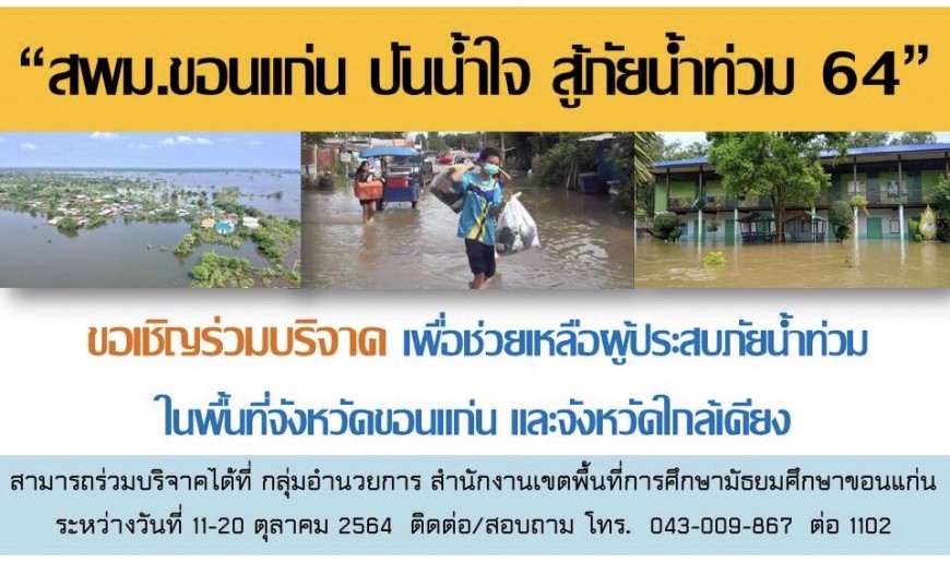 | ขอเชิญร่วมบริจาค สพม.ขอนแก่น ปันน้ำใจ สู้ภัยน้ำท่วม 2564