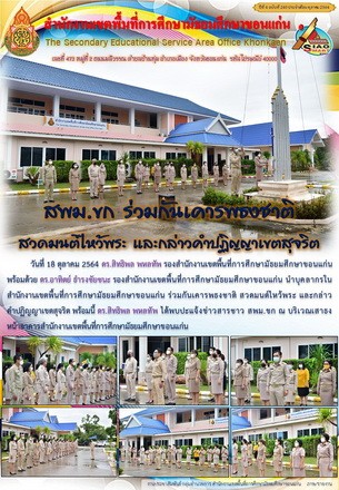 | กลับหน้าหลัก | สพม.ขก ร่วมกันเคารพธงชาติ สวดมนต์ไหว้พระ และกล่าวคำปฏิญญาเขตสุจริต |