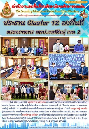 วันที่ 3 ธันวาคม 2564 นายจักราวุธ สอนโกษา ผู้อำนวยการสำนักงานเขตพื้นที่การศึกษามัธยมศึกษาขอนแก่น ประธานกรรมการบริหารกลุ่มพื้นที่การศึกษาประจำเขตตรวจราชการที่ 12 (ร้อยเอ็ด ขอนแก่น มหาสารคาม กาฬสินธุ์) ลงพื้นที่ตรวจราชการที่สำนักงานเขตพื้นที่การศึกษาประถมศึกษากาฬสินธุ์ เขต 2 โดยมีนายสุรเชษฐ์ พละเอ็น ผู้อำนวยการสำนักงานเขตพื้นที่การศึกษาประถมศึกษากาฬสินธุ์ เขต 2 พร้อมคณะให้การต้อนรับ อำนวยความสะดวกในการตรวจราชการ พร้อมนี้ นายจักราวุธ สอนโกษา ได้ร่วมให้กำลังใจคณะกรรมการประเมินสัมฤทธิผลฯ และคณะผู้เข้ารับการประเมินสัมฤทธิผลการปฏิบัติงานในหน้าที่ผู้อำนวยการสถานศึกษา ในรอบ 1 ปี สังกัด สพป.กส.2 ณ ห้องประชุมโปงลาง 1 สำนักงานเขตพื้นที่การศึกษาประถมศึกษากาฬสินธุ์ เขต 2 อ.ห้วยเม็ก จ.กาฬสินธุ์ |