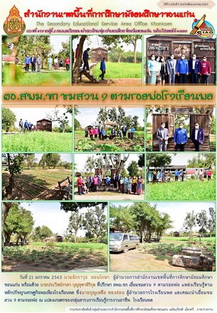 | วันที่ 21 มกราคม 2565 นายจักราวุธ สอนโกษา ผู้อำนวยการสำนักงานเขตพื้นที่การศึกษามัธยมศึกษาขอนแก่น พร้อมด้วย นายประวิทย์กาสา บุญจุฑาสิริกุล ที่ปรึกษา สพม.ขก เยี่ยมชมสวน 9 ตามรอยพ่อ แหล่งเรียนรู้ตามหลักปรัชญาเศรษฐกิจพอเพียงโรงเรียนพล ซึ่งนายบุญเหลือ ทองอ่อน ผู้อำนวยการโรงเรียนพล และคณะนำเยี่ยมชมสวน 9 ตามรอยพ่อ ณ แปลงเกษตรของกลุ่มสาระการเรียนรู้การงานอาชีพ โรงเรียนพล | |