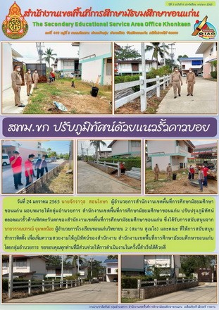 วันที่ 24 มกราคม 2565 นายจักราวุธ สอนโกษา ผู้อำนวยการสำนักงานเขตพื้นที่การศึกษามัธยมศึกษาขอนแก่น มอบหมายให้กลุ่มอำนวยการ สำนักงานเขตพื้นที่การศึกษามัธยมศึกษาขอนแก่น ปรับปรุงภูมิทัศน์ ตลอดแนวรั้วด้านทิศตะวันตกของสำนักงานเขตพื้นที่การศึกษามัธยมศึกษาขอนแก่น ซึ่งได้รับการสนับสนุนจากนายวรรณปกรณ์ จุมพลน้อย ผู้อำนวยการโรงเรียนขอนแก่นวิทยายน 2 (สมาน สุเมโธ) และคณะ ที่ให้การสนับสนุน ทำการติดตั้ง เพื่อเพิ่มความสวยงามให้ภูมิทัศน์ของสำนักงาน สำนักงานเขตพื้นที่การศึกษามัธยมศึกษาขอนแก่น โดยกลุ่มอำนวยการ ขอขอบคุณทุกท่านที่มีส่วนช่วยให้การดำเนินงานในครั้งนี้สำเร็จได้ด้วยดี |
