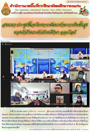 วันที่ 25 มกราคม 2565 นายจักราวุธ สอนโกษา ผู้อำนวยการสำนักงานเขตพื้นที่การศึกษามัธยมศึกษาขอนแก่น เป็นประธานเปิดการประชุมชี้แจงการดำเนินโครงการพัฒนาทักษะการคิดชั้นสูงของนักเรียนระดับมัธยมศึกษาขอนแก่น ผ่านระบบอิเล็กทรอนิกส์ ZOOM ซึ่งมีครูเข้าร่วมจำนวน 140 ราย โดยมีวัตถุประสงค์เพื่อพัฒนาความสามารถด้านการจัดการเรียนรู้ สนับสนุนให้จัดสถานศึกษาให้มีสภาพแวดล้อมเอื้อต่อการเรียนรู้และพัฒนาทักษะการคิดขั้นสูง นิเทศ ติดตามและประเมินผล นำเสนอผลงานที่เป็นเลิศของนักเรียนในสังกัด ผ่านระบบอิเล็กทรอนิกส์ ณ ห้องส่งสัญญาณห้องประชุมออนซอนเสี่ยว |