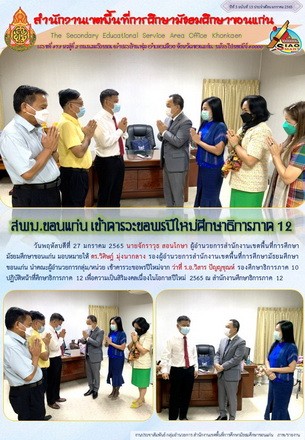 | วันพฤหัสบดีที่ 27 มกราคม 2565 นายจักราวุธ สอนโกษา ผู้อำนวยการสำนักงานเขตพื้นที่การศึกษามัธยมศึกษาขอนแก่น มอบหมายให้ ดร.วิศิษฎ์ มุ่งนากลาง รองผู้อำนวยการสำนักงานเขตพื้นที่การศึกษามัธยมศึกษาขอนแก่น นำคณะผู้อำนวยการกลุ่ม/หน่วย เข้าคารวะขอพรปีใหม่จาก ว่าที่ ร.อ.วิสาร ปัญญชุณห์ รองศึกษาธิการภาค 10 ปฏิบัติหน้าที่ศึกษาธิการภาค 12 เพื่อความเป็นสิริมงคลเนื่องในโอกาสปีใหม่ 2565 ณ สำนักงานศึกษาธิการภาค 12 | |