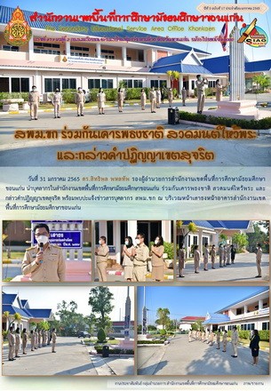 | กลับหน้าหลัก | สพม.ขก ร่วมกันเคารพธงชาติ สวดมนต์ไหว้พระ และกล่าวคำปฏิญญาเขตสุจริต |