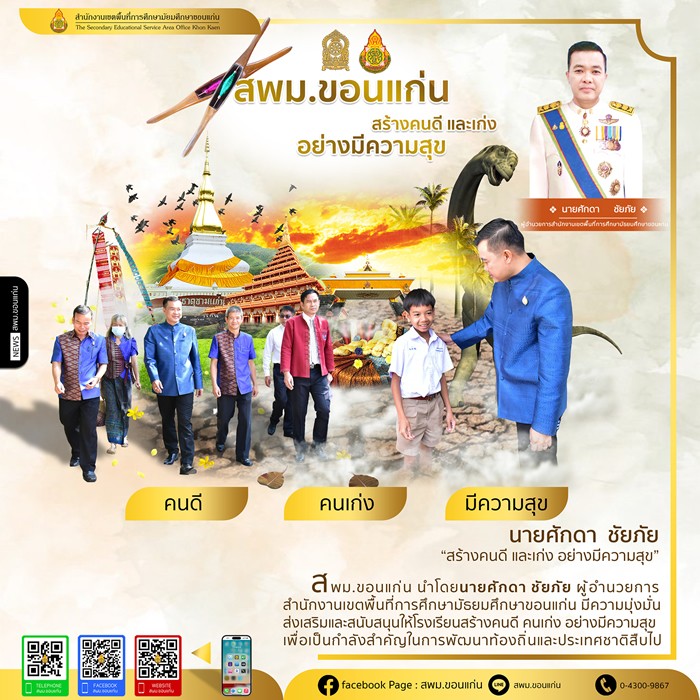 | สพม.ขอนแก่น นำโดยนายศักดา ชัยภัย ผู้อำนวยการสำนักงานเขตพื้นที่กาศึกษามัธยมศึกษาขอนแก่น มีความมุ่งมั่น ส่งเสริมและสนับสนุนให้โรงเรียนสร้างคนดี คนเก่ง อย่างมีความสุข เพื่อเป็นกำลังสำคัญในการพัฒนาท้องถิ่นและประเทศชาติสืบไป | |