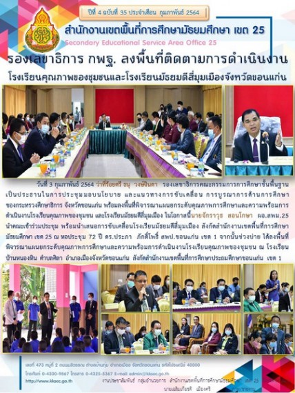 3 กุมภาพันธ์ 2564 ว่าที่ร้อยตรี ธนุ วงษ์จินดา รองเลขาธิการคณะกรรมการการศึกษาขั้นพื้นฐาน เป็นประธานในการประชุมมอบนโยบาย และแนวทางการขับเคลื่อน การบูรณาการด้านการศึกษา ของกระทรวงศึกษาธิการ จังหวัดขอนแก่น พร้อมลงพื้นที่พิจารณาแผนยกระดับคุณภาพการศึกษาและความพร้อมการดำเนินงานโรงเรียนคุณภาพของชุมชน และโรงเรียนมัธยมดีสี่มุมเมือง ในโอกาสนี้นายจักราวุธ สอนโกษา ผอ.สพม.25 นำคณะเข้าร่วมประชุม พร้อมนำเสนอการขับเคลื่อนโรงเรียนมัธยมดีสี่มุมเมือง สังกัดสำนักงานเขตพื้นที่การศึกษามัธยมศึกษา เขต 25 ณ หอประชุม 72 ปี ดร.ประภา ภักดิ์โพธิ์ สพป.ขอนแก่น เขต 1 จากนั้นช่วงบ่าย ได้ลงพื้นที่พิจารณาแผนยกระดับคุณภาพการศึกษาและความพร้อมการดำเนินงานโรงเรียนคุณภาพของชุมชน ณ โรงเรียนบ้านหนองหิน ตำบลศิลา อำเภอเมืองจังหวัดขอนแก่น สังกัดสำนักงานเขตพื้นที่การศึกษาประถมศึกษาขอนแก่น เขต 1 |