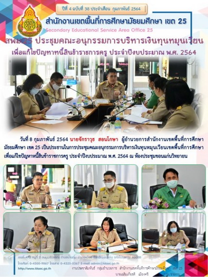 | วันที่ 8 กุมภาพันธ์ 2564 นายจักราวุธ สอนโกษา ผู้อำนวยการสำนักงานเขตพื้นที่การศึกษามัธยมศึกษา เขต 25 เป็นประธานในการประชุมคณะอนุกรรมการบริหารเงินทุนหมุนเวียนเขตพื้นที่การศึกษา เพื่อแก้ไขปัญหาหนี้สินข้าราชการครู ประจำปีงบประมาณ พ.ศ. 2564 ณ ห้องประชุมขอนแก่นวิทยายน | |