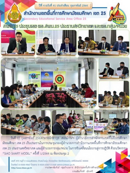 | วันที่ 10 กุมภาพันธ์ 2564 นายจักราวุธ สอนโกษา ผู้อำนวยการสำนักงานเขตพื้นที่การศึกษามัธยมศึกษา เขต 25 เป็นประธานในการประชุมรองผู้อำนวยการสำนักงานเขตพื้นที่การศึกษามัธยมศึกษา เขต 25 ประธานสหวิทยาเขต และผู้อำนวยการกลุ่ม/หน่วย ในการขับเคลื่อนนโยบายสู่การปฏิบัติ ด้วยนวัตกรรม “SIAO SMART MODEL” ครั้งที่ 1/2564 ณ ห้องประชุม 2 | |