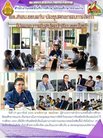 | วันที่ 19 กุมภาพันธ์ 2564 นายจักราวุธ สอนโกษา ผู้อำนวยการสำนักงานเขตพื้นที่การศึกษามัธยมศึกษาขอนแก่น เป็นประธานในการประชุมคณะกรรมการจัดทำโปรแกรมการรับสมัครนักเรียนออนไลน์ ปีการศึกษา 2564 เพื่อให้การรับสมัครนักเรียนในสถานการณ์การแพร่ระบาดของโรคติดเชื้อไวรัสโคโรนา 2019 ของโรงเรียนในสังกัด เป็นไปด้วยความเรียบร้อย และเป็นแนวทางเดียวกัน ณ หอประชุมขอนแก่นวิทยายน | |