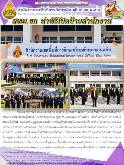 วันที่ 24 กุมภาพันธ์ 2564 นายจักราวุธ สอนโกษา ผู้อำนวยการสำนักงานเขตพื้นที่การศึกษามัธยมศึกษาขอนแก่น พร้อมด้วยคณะผู้บริหาร ประธานสหวิทยาเขต บุคลากร และตัวแทนจากโรงเรียน ร่วมกันเข้าแถวเคารพธงชาติ สวดมนต์ไหว้พระ และกล่าวคำปฏิญญาณเขตสุจริต จากนั้นผู้อำนวยการสำนักงานเขตพื้นที่การศึกษามัธยมศึกษาขอนแก่น ได้อ่านประกาศกระทรวงศึกษาธิการ เรื่อง การกำหนดและแก้ไขเปลี่ยนแปลงเขตพื้นที่การศึกษามัธยมศึกษา ที่ประกาศ ณ วันที่ 28 มกราคม 2564 เผยแพร่ในราชกิจจานุเบกษา เล่ม 138 ตอนพิเศษ 38 ง 17 กุมภาพันธ์ 2564 หน้า 4-9 ซึ่ง สพฐ. กำหนดให้เขตพื้นที่การศึกษามัธยมศึกษาขอนแก่น ประกอบด้วยท้องที่จังหวัดขอนแก่น อักษรย่อ สพม.ขก มีโรงเรียนในสังกัด จำนวน 84 โรงเรียน จากนั้นผู้ร่วมงานทั้งหมดได้รวมกันถ่ายภาพเป็นที่ระลึก บรรยากาศเป็นไปด้วยความเรียบร้อย ท่ามกลางมาตรการรักษาความปลอดภัยด้านการป้องกันการแพร่ระบาดของเชื้อไวรัสโคโรนา 2019 อย่างเคร่งครัด ณ สำนักงานเขตพื้นที่การศึกษามัธยมศึกษาขอนแก่น |