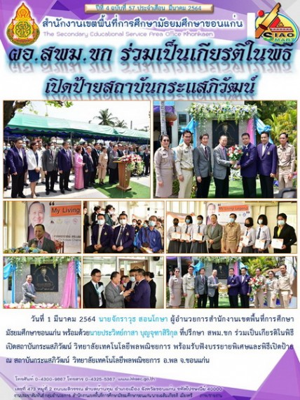 | วันที่ 1 มีนาคม 2564 นายจักราวุธ สอนโกษา ผู้อำนวยการสำนักงานเขตพื้นที่การศึกษามัธยมศึกษาขอนแก่น พร้อมด้วยนายประวิทย์กาสา บุญจุฑาสิริกุล ที่ปรึกษา สพม.ขก ร่วมเป็นเกียรติในพิธีเปิดสถาบันกระแสภิวัฒน์ วิทยาลัยเทคโนโลยีพลพณิชยการ พร้อมรับฟังบรรยายพิเศษและพิธีเปิดป้าย ณ สถาบันกระแสภิวัฒน์ วิทยาลัยเทคโนโลยีพลพณิชยการ อ.พล จ.ขอนแก่น | |