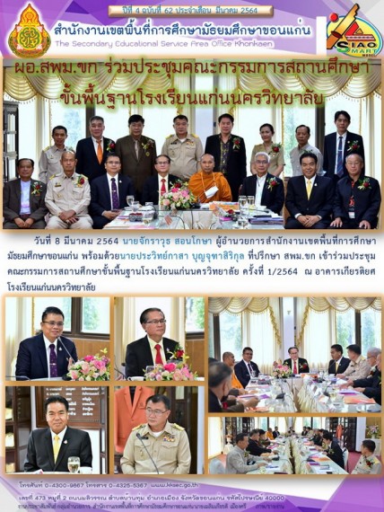 | วันที่ 8 มีนาคม 2564 นายจักราวุธ สอนโกษา ผู้อำนวยการสำนักงานเขตพื้นที่การศึกษามัธยมศึกษาขอนแก่น พร้อมด้วยนายประวิทย์กาสา บุญจุฑาสิริกุล ที่ปรึกษา สพม.ขก เข้าร่วมประชุมคณะกรรมการสถานศึกษาขั้นพื้นฐานโรงเรียนแก่นนครวิทยาลัย ครั้งที่ 1/2564 ณ อาคารเกียรติยศ โรงเรียนแก่นนครวิทยาลัย | |