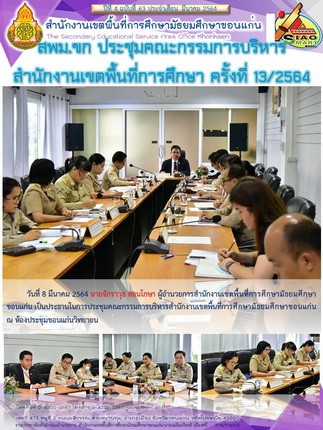 | วันที่ 8 มีนาคม 2564 นายจักราวุธ สอนโกษา ผู้อำนวยการสำนักงานเขตพื้นที่การศึกษามัธยมศึกษาขอนแก่น เป็นประธานในการประชุมคณะกรรมการบริหารสำนักงานเขตพื้นที่การศึกษามัธยมศึกษาขอนแก่น ครั้งที่ 13/2564 ณ ห้องประชุมขอนแก่นวิทยายน | |