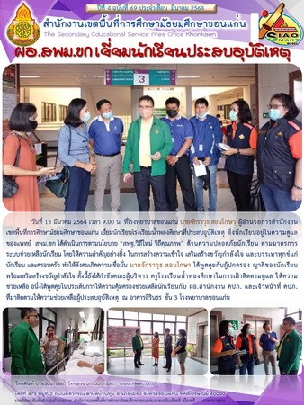 วันที่ 13 มีนาคม 2564 เวลา 9.00 น. ที่โรงพยาบาลขอนแก่น นายจักราวุธ สอนโกษา ผู้อำนวยการสำนักงานเขตพื้นที่การศึกษามัธยมศึกษาขอนแก่น เยี่ยมนักเรียนโรงเรียนน้ำพองศึกษาที่ประสบอุบัติเหตุ ซึ่งนักเรียนอยู่ในความดูแลของแพทย์ สพม.ขก ได้ดำเนินการตามนโยบาย “สพฐ.วิถีใหม่ วิถีคุณภาพ” ด้านความปลอดภัยนักเรียน ตามมาตรการระบบช่วยเหลือนักเรียน โดยให้ความสำคัญอย่างยิ่ง ในการสร้างความเข้าใจ เสริมสร้างขวัญกำลังใจ และบรรเทาทุกข์แก่นักเรียน และครอบครัว ทำให้สังคมเกิดความเชื่อมั่น นายจักราวุธ สอนโกษา ได้พูดคุยกับผู้ปกครอง ญาติของนักเรียน พร้อมเสริมสร้างขวัญกำลังใจ ทั้งนี้ยังได้กำชับคณะผู้บริหาร ครูโรงเรียนน้ำพองศึกษาในการเฝ้าติดตามดูแล ให้ความช่วยเหลือ อนึ่งได้พูดคุยในประเด็นการให้ความคุ้มครองช่วยเหลือนักเรียนกับ ผอ.สำนักงาน คปภ. และเจ้าหน้าที่ คปภ.ที่มาติดตามให้ความช่วยเหลือผู้ประสบอุบัติเหตุ ณ อาคารสิรินธร ชั้น 3 โรงพยาบาลขอนแก่น |