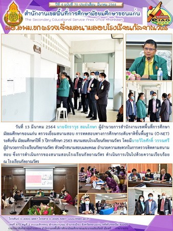 | วันที่ 13 มีนาคม 2564 นายจักราวุธ สอนโกษา ผู้อำนวยการสำนักงานเขตพื้นที่การศึกษามัธยมศึกษาขอนแก่น ตรวจเยี่ยมสนามสอบ การทดสอบทางการศึกษาระดับชาติขั้นพื้นฐาน (O-NET) ระดับชั้น มัธยมศึกษาปีที่ 3 ปีการศึกษา 2563 สนามสอบโรงเรียนกัลยาณวัตร โดยมีนายวิไลศักดิ์ วรรณศรี ผู้อำนวยการโรงเรียนกัลยาณวัตร หัวหน้าสนามสอบและคณะ อำนวยความสะดวกในการตรวจติดตามสนามสอบ ซึ่งการดำเนินการของสนามสอบโรงเรียนกัลยาณวัตร ดำเนินการเป็นไปด้วยความเรียบร้อย ณ โรงเรียนกัลยาณวัตร | |