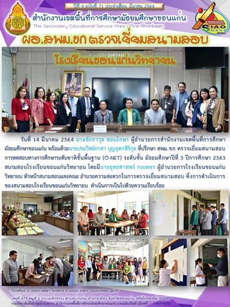 | วันที่ 14 มีนาคม 2564 นายจักราวุธ สอนโกษา ผู้อำนวยการสำนักงานเขตพื้นที่การศึกษามัธยมศึกษาขอนแก่น พร้อมด้วยนายประวิทย์กาสา บุญจุฑาสิริกุล ที่ปรึกษา สพม.ขก ตรวจเยี่ยมสนามสอบ การทดสอบทางการศึกษาระดับชาติขั้นพื้นฐาน (O-NET) ระดับชั้น มัธยมศึกษาปีที่ 3 ปีการศึกษา 2563 สนามสอบโรงเรียนขอนแก่นวิทยายน โดยมีนายยุทธศาสตร์ กงเพชร ผู้อำนวยการโรงเรียนขอนแก่นวิทยายน หัวหน้าสนามสอบและคณะ อำนวยความสะดวกในการตรวจเยี่ยมสนามสอบ ซึ่งการดำเนินการของสนามสอบโรงเรียนขอนแก่นวิทยายน ดำเนินการเป็นไปด้วยความเรียบร้อย | |