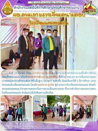 | วันที่ 14 มีนาคม 2564 นายจักราวุธ สอนโกษา ผู้อำนวยการสำนักงานเขตพื้นที่การศึกษามัธยมศึกษาขอนแก่น พร้อมด้วยนายประวิทย์กาสา บุญจุฑาสิริกุล ที่ปรึกษา สพม.ขก ตรวจเยี่ยมสนามสอบ การทดสอบทางการศึกษาระดับชาติขั้นพื้นฐาน (O-NET) ระดับชั้น มัธยมศึกษาปีที่ 3 ปีการศึกษา 2563 สนามสอบโรงเรียนนครขอนแก่น โดยมีนายอภิชาติ อุ่นเกิด ผู้อำนวยการโรงเรียนนครขอนแก่นหัวหน้าสนามสอบและคณะ อำนวยความสะดวกในการตรวจเยี่ยมสนามสอบ ซึ่งการดำเนินการของสนามสอบโรงเรียนนครขอนแก่น ดำเนินการเป็นไปด้วยความเรียบร้อย | |