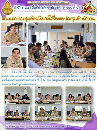 | วันที่ 15 มีนาคม 2564 นายจักราวุธ สอนโกษา ผู้อำนวยการสำนักงานเขตพื้นที่การศึกษามัธยมศึกษาขอนแก่น เป็นประธานในการประชุมคณะกรรมการพิจารณาคัดเลือกตั้งชื่อหอประชุมสำนักงานเขตพื้นที่การศึกษามัธยมศึกษาขอนแก่น ครั้งที่ 1/2564 ซึ่งมีผู้ส่งผลงานเข้าประกวด จำนวนทั้งสิ้น 20 ผลงาน ณ ห้องประชุมขอนแก่นวิทยายน | |