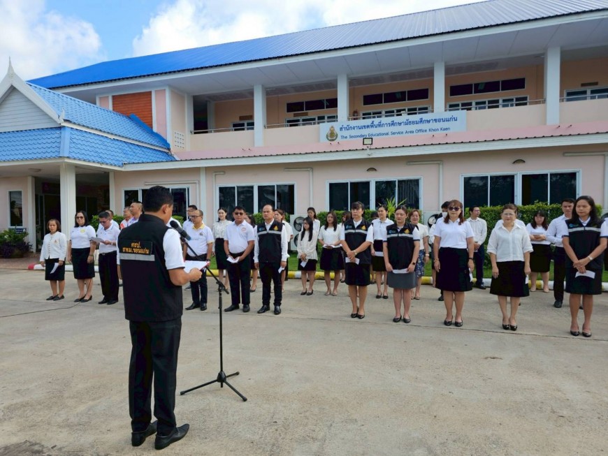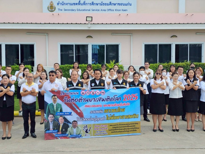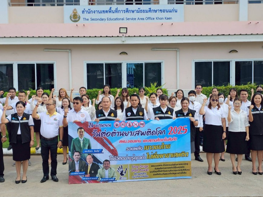 เช้าวันนี้ (26 มิถุนายน 2568) ที่บริเวณลานเสาธงชาติ หน้าสำนักงานเขตพื้นที่การศึกษามัธยมศึกษาขอนแก่น ดร.ศักดา ชัยภัย ผู้อำนวยการสำนักงานเขตพื้นที่การศึกษามัธยมศึกษาขอนแก่น มอบหมายให้ ดร.ทวีศักดิ์ สมนอก รองผู้อำนวยการสำนักงานเขตพื้นที่การศึกษามัธยมศึกษาขอนแก่น นำข้าราชการและลูกจ้างในสำนักงานเขตพื้นที่การศึกษามัธยมศึกษาขอนแก่น จัดกิจกรรมเข้าแถวเคารพธงชาติและกิจกรรมรณรงค์เนื่องในวันต่อต้านยาเสพติดโลก เพื่อให้ทุกคนได้ตระหนักรับรู้ และเข้าใจถึงสถานการณ์ปัญหายาเสพติด ซึ่งเป็นภัยร้ายทำลายครอบครัว สังคม และประเทศชาติ ตลอดจนเพื่อให้ทุกคนเห็นถึงความสำคัญในการเข้ามามีส่วนร่วมป้องกันและแก้ไขปัญหายาเสพติดอย่างจริงจังและต่อเนื่อง พร้อมกันนี้ยังได้นำผู้เข้าร่วมกิจกรรมทุกคนกล่าวคำปฏิญาณต่อต้านยาเสพติด เพื่อเป็นพลังแผ่นดินสนับสนุนนโยบายกระทรวงศึกษาธิการและของรัฐบาลในการต่อต้านยาเสพติดทุกรูปแบบ |