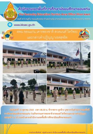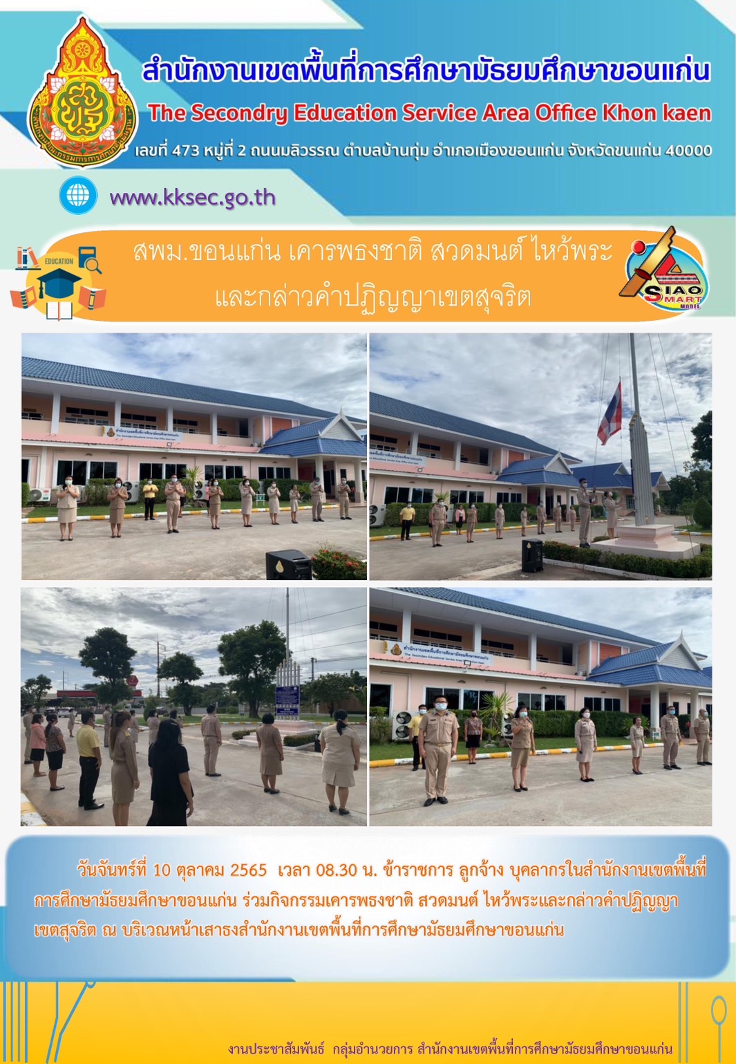 วันจันทร์ที่ 10 ตุลาคม 2565 เวลา 08.30 น. ข้าราชการ ลูกจ้าง บุคลากรในสำนักงานเขตพื้นที่การศึกษามัธยมศึกษาขอนแก่น ร่วมกิจกรรมเคารพธงชาติ สวดมนต์ ไหว้พระและกล่าวคำปฏิญญาเขตสุจริต ณ บริเวณหน้าเสาธงสำนักงานเขตพื้นที่การศึกษามัธยมศึกษาขอนแก่น