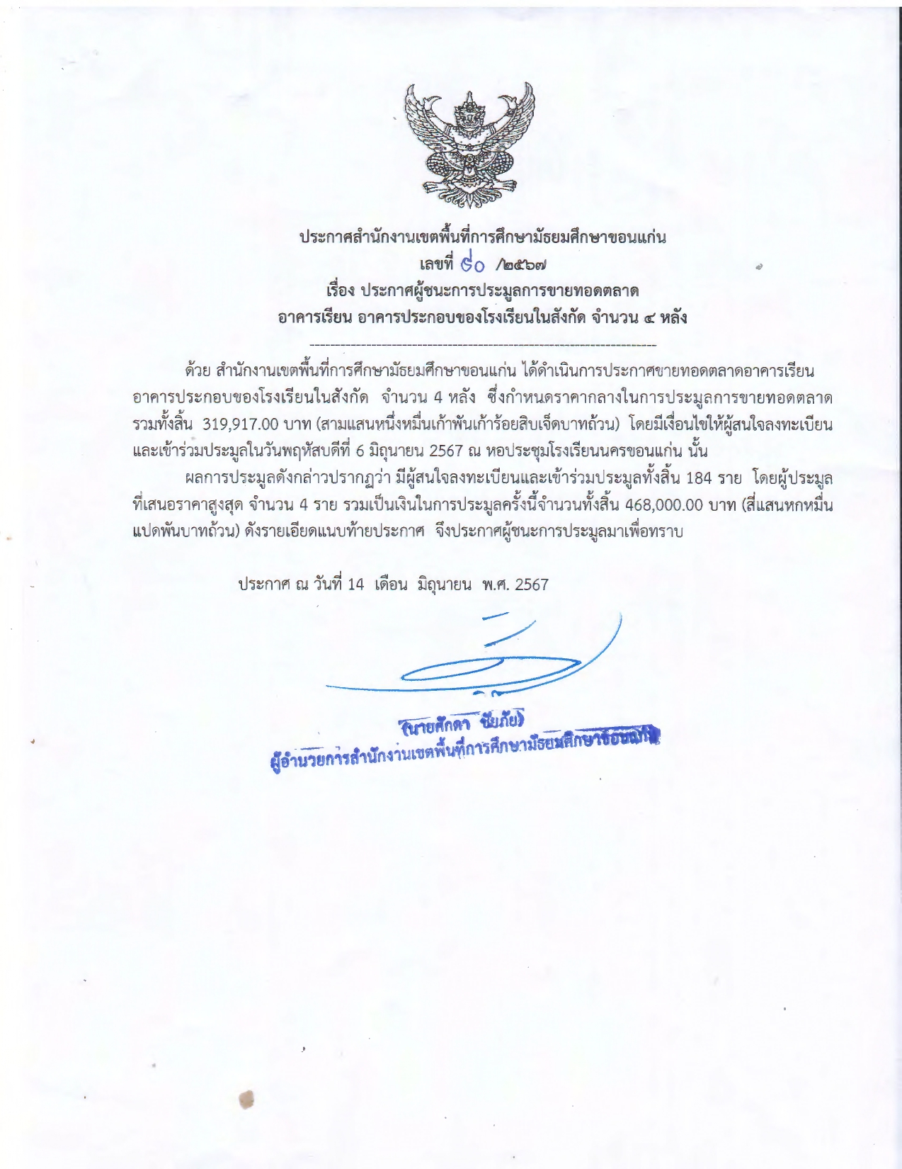 ประกาศผู้ชนะการประมูลการขายทอดตลาดอาคารเรียน อาคารประกอบของโรงเรียนในสังกัด ประจำปีงบประมาณ พ.ศ.2567