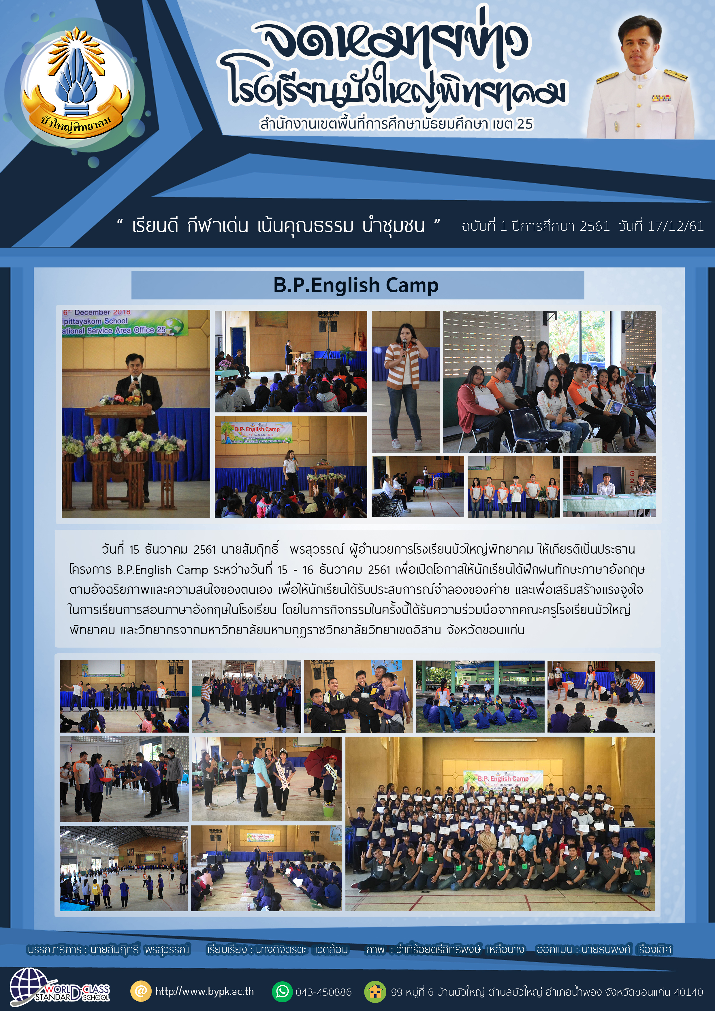 โรงเรียนบัวใหญ่พิทยาคม โดยกลุ่มสาระการเรียนรู้ภาษาต่างประเทศ ได้จัดโครงการเข้าค่าย B.P English Camp ในระหว่างวันที่ 15-16 ธันวาคม 2561 ที่หอประชุมโรงเรียนบัวใหญ่พิทยาคม เพื่อให้ผู้เรียนมีทัศนคติที่ดีต่อภาษาอังกฤษ กล้าพูดและสื่อสารภาษาอังกฤษได้ ทั้งนี้ได้รับความอนุเคราะห์วิทยากรจากมหาวิทยาลัยมหามกุฎราชวิทยาลัย วิทยาเขตอีสาน