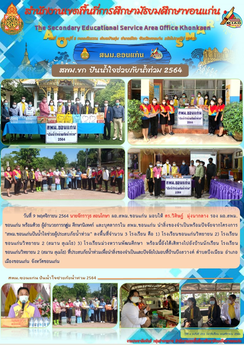 วันที่ 9 พฤศจิกายน 2564 นายจักราวุธ สอนโกษา ผอ.สพม.ขอนแก่น มอบให้ ดร.วิศิษฎ์ มุ่งนากลาง รอง ผอ.สพม.ขอนแก่น พร้อมด้วย ผู้อำนวยการกลุ่ม ศึกษานิเทศก์ และบุคลากรใน สพม.ขอนแก่น นำสิ่งของจำเป็นพร้อมปัจจัยจากโครงการ "สพม.ขอนแก่นปันน้ำใจช่วยผู้ประสบภัยน้ำท่วม" ลงพื้นที่จำนวน 3 โรงเรียน คือ 1) โรงเรียนขอนแก่นวิทยายน 2) โรงเรียนขอนแก่นวิทยายน 2 (สมาน สุเมโธ) 3) โรงเรียนม่วงหวานพัฒนศึกษา พร้อมนี้ยังได้เดิทางไปยังบ้านนักเรียน โรงเรียนขอนแก่นวิทยายน 2 (สมาน สุเมโธ) ที่ประสบภัยน้ำท่วมเพื่อนำสิ่งของจำเป็นและปัจจัยไปมอบที่บ้านบึงสวางค์ ตำบลบึงเนียม อำเภอเมืองขอนแก่น จังหวัดขอนแก่น